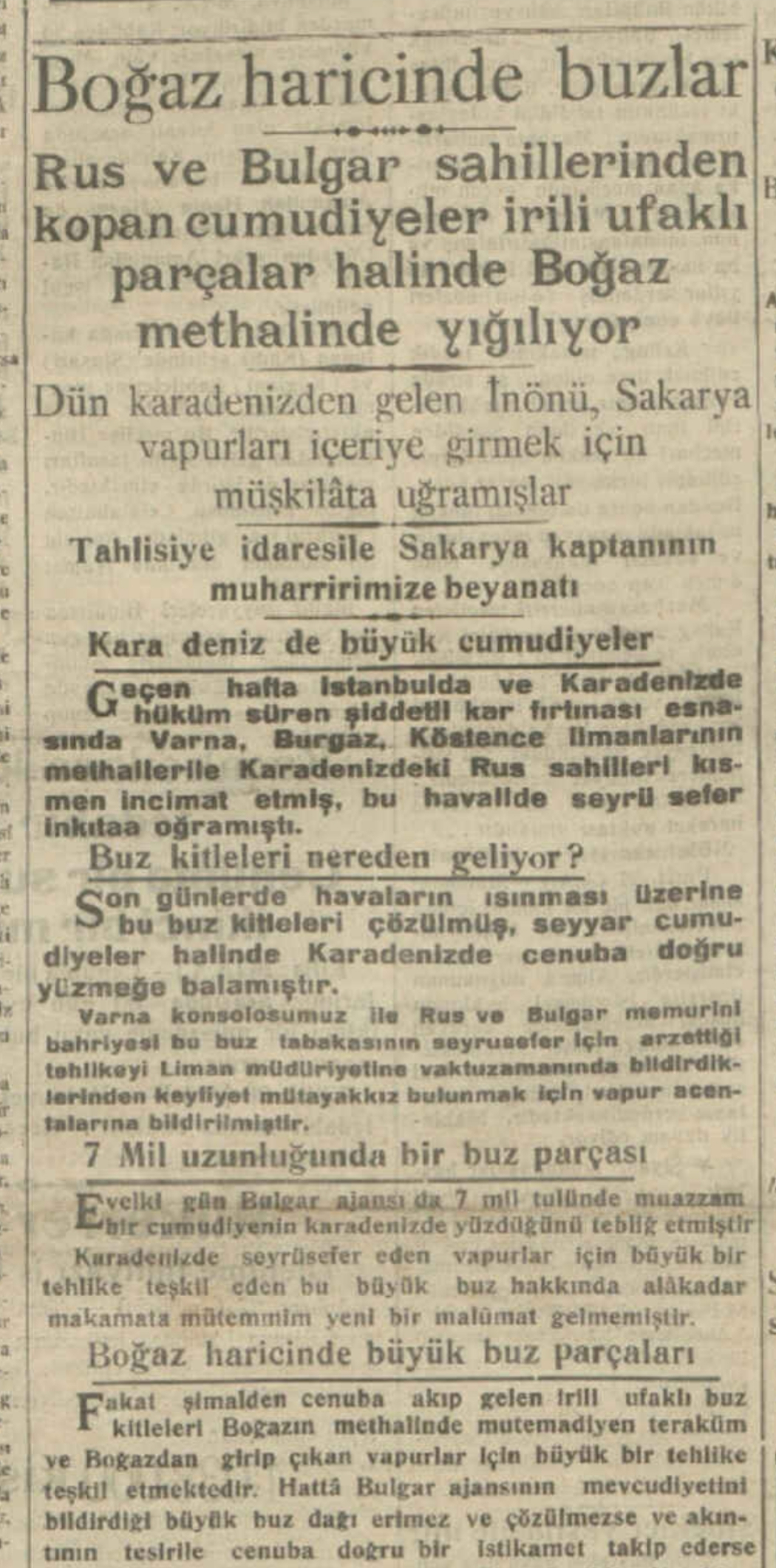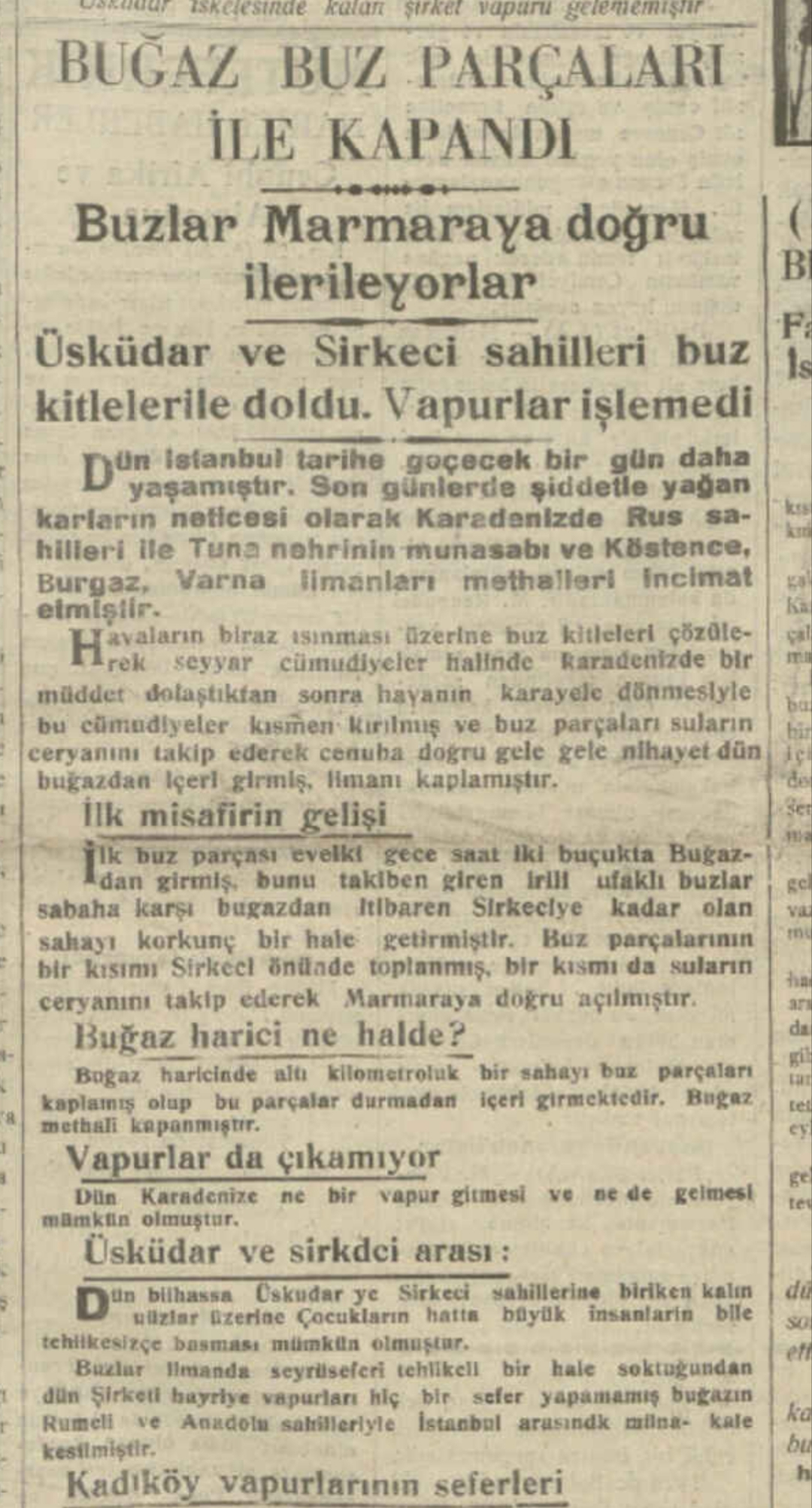 Gece yarısı saat ikide, İstanbul Boğazı aniden büyük buz kütlelerinin hücumuna uğradı. Bütün liman buzlarla kaplandı. Bir işgal kuvveti gibi İstanbul’a giren buz ordusunun bir bölümü Anadolu sahilini takip ederek Haydarpaşa tarafına, bir kısmı Sarayburnu önlerinden geçerek Marmara’ya, bir bölümü de Sirkeci rıhtımına doğru yola çıktı. Marmara tarafına geçen buzların bir bölümü Hayırsızada tarafına, Sirkeci önlerine gelenlerin bir bölümü Galata’ya hareket edip buraları ele geçirdi. Buzların kalınlığı bazı gazetelere göre 10 ile 50 santim, bazı gazetelere göre de 3 ile 10 metre arasında değişiyordu. Sirkeci rıhtımı önlerinde toplanan meraklıların en maceraperestleri, yakaladıkları buzlara çıktılar ve üstlerinde dakikalarca dolaştılar. Ortalık çok eğlenceli bir panayır yerine döndü ve kalabalık giderek arttı.