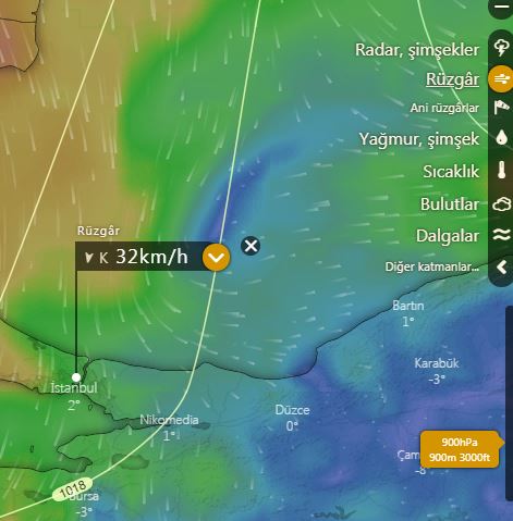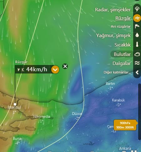 1. Görselde açıklarda görünen siklonik yapı düşük seviye AB'si mi oluyor? Yüzeyden 800hPa'ya kadar gözlemlenebiliyor. 2. Görsele göre siklonun hareki ilerleyen saatlerde Düzce-Zonguldak yününde olacak.
