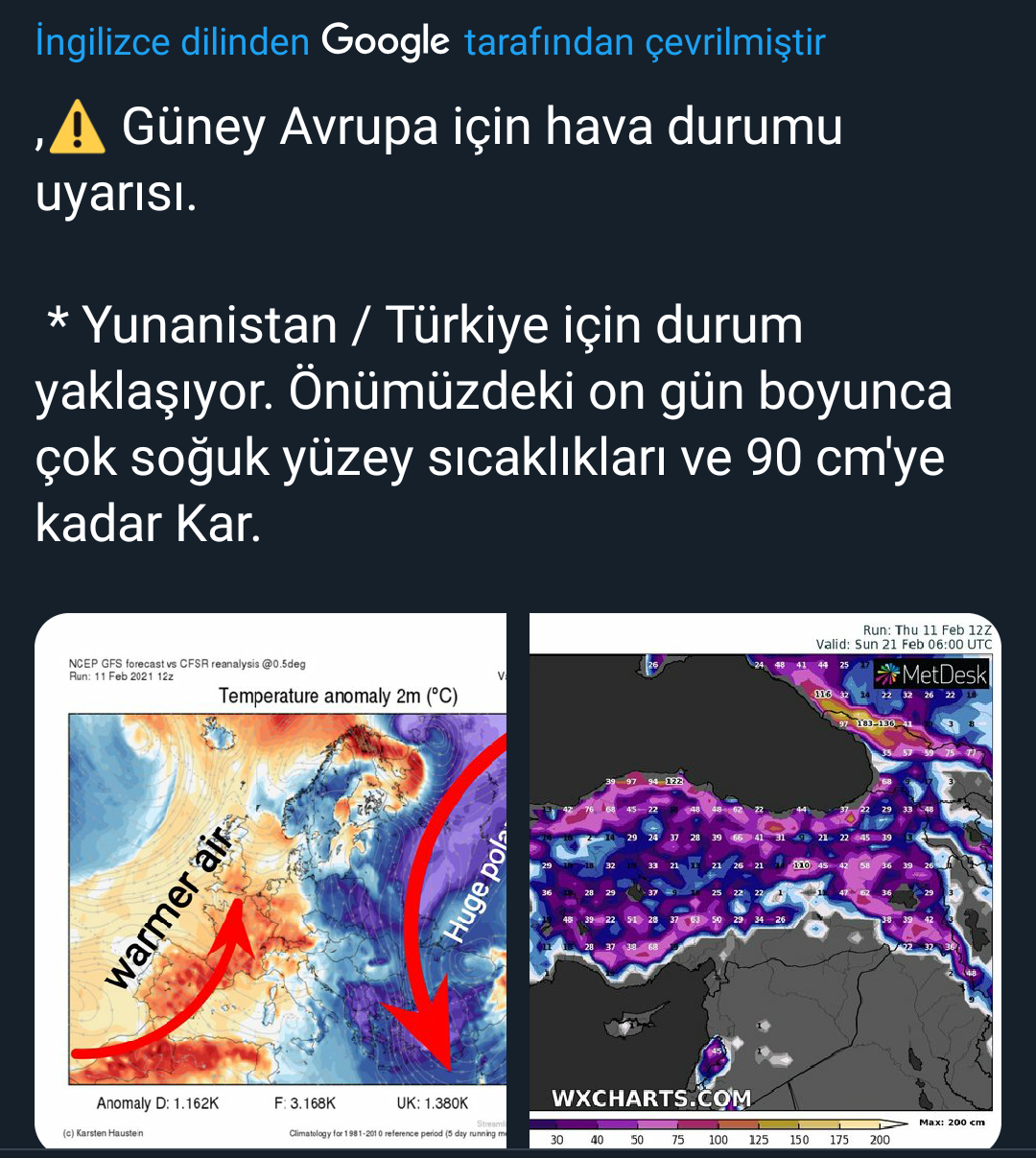 Yabancı, amatör meteoroloji uzmanı abimiz Türkiye için soğuk ve kar uyarıları veriyor. Özel mesajlardan takipçilerine uyarılarımı dikkate alın vs. Diye mesaj atmış.