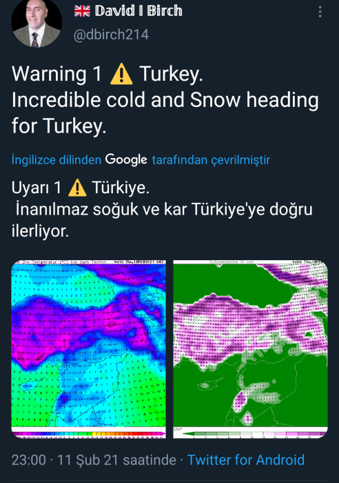 (12-02-2021, Saat: 12:49)Kemal Ensar1 Nickli Kullanıcıdan Alıntı: Yabancı, amatör meteoroloji uzmanı abimiz Türkiye için soğuk ve kar uyarıları veriyor. Özel mesajlardan takipçilerine uyarılarımı dikkate alın vs. Diye mesaj atmış. Kadir Sütçü değil mi o?