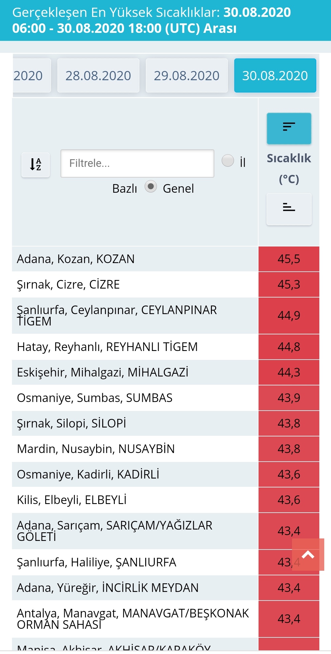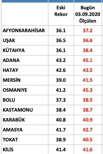 Adana, Urfa, Hatay gibi şehirlerde, 3-6 Eylül tarihleri (perşembe - pazar günleri arası ) hava sıcaklığının 50 derecelere dayanması bekleniyor. Aşırı sıcaklara karşı tedbirli olunması gerekiyor! Belki de doğuda öğle arasının 12-15 saatleri arasına çekilmesi isabetli olabilir . Ne yazık ki, aşırı sıcaklardan dolayı,  hayatını kaybedecek vatandaşların haberlerini duymak çok şaşırtıcı olmayacak bu hafta. Mümkünse yaşlı ve hastaların öğle saatlerinde dışarı çıkmaması gerekiyor.