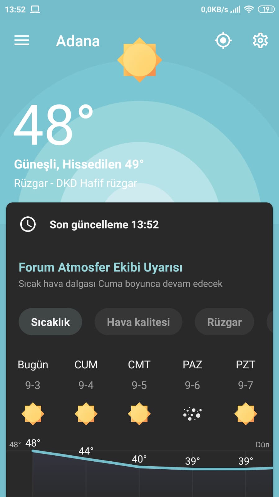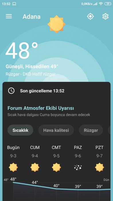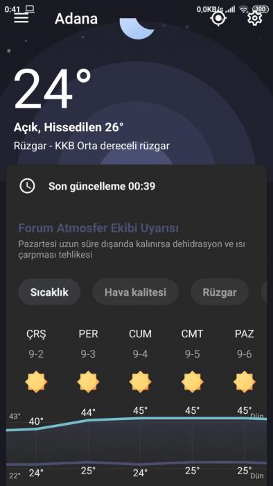 Bizim uygulamanın yapay zekası cuma günü 45 derece diye tahmin etmiş şu anlık Adana'nın merkezini. Serkan abinin attığı gibi bazı kaynaklar 49 derece diye tahmin ediyor. Neredeyse bir afet sayılır bu sıcaklık.