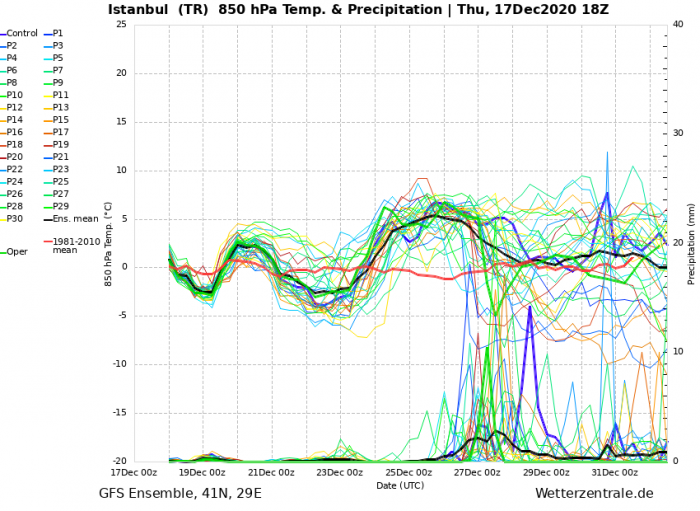 Öncelikle 23'ündeki soğuk çekirdek ısrarla Kafkaslardan daha aşağı inmemekte kararlı. Birkaç gün önce senaryolarda daha fazla bize sokuluyordu ve iç bölgelerde doğu Akdeniz'den tırmanan AB ile kar yağışları bırakıyordu. Son durumda, iç bölgeler yine kuru soğuk çekecek gibi duruyor. Yani bizim zaten bi beklentimiz yoktu, en iyi ihtimalle Aydos kar görebilir diyorduk, o da gümledi. Sonrasında diyagramda göründüğü üzere bir dalgalanma var. 25-26'sından sonra batı Avrupa noellerini karlı geçirecek gibi duruyor. Israrla kaç gündür gösteriyor ve değişmeden de olacak gibi. Bize gösterse kırk kere takla atardı modeller. Tabii batı soğuk tarafta kalınca, biz birkaç gün sıcak tarafta kalacağız. Lodos ve yağışlı birkaç gün olacak gibi duruyor. Sonrasında ise 27'sinden itibaren tekrar aşağı yönlü senaryolar var. Keşke soğuk kuvveti artsa da lodos arkası karayelli bir sistem alsak. Bakalım 27'sinden sonra görünen ihtimaller yılbaşına kadar olan süreçte bir sisteme dönüşecek mi? Yoksa ocak ilk günlere mi kalacak sistem? Yalnız model sonlarında aşağıya inmeye meyilli inanılmaz soğuk deposu beliriyor. Umarım bu potansiyel bizi ıskalamaz. Sibirya'dan ağrı (Giresunlu değilim ama Giresunlular anladı ) bir alamet kopup gelse ne fena olur ama.