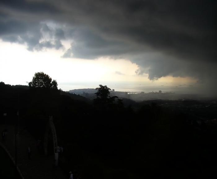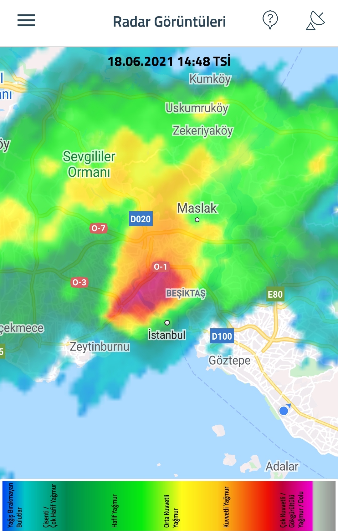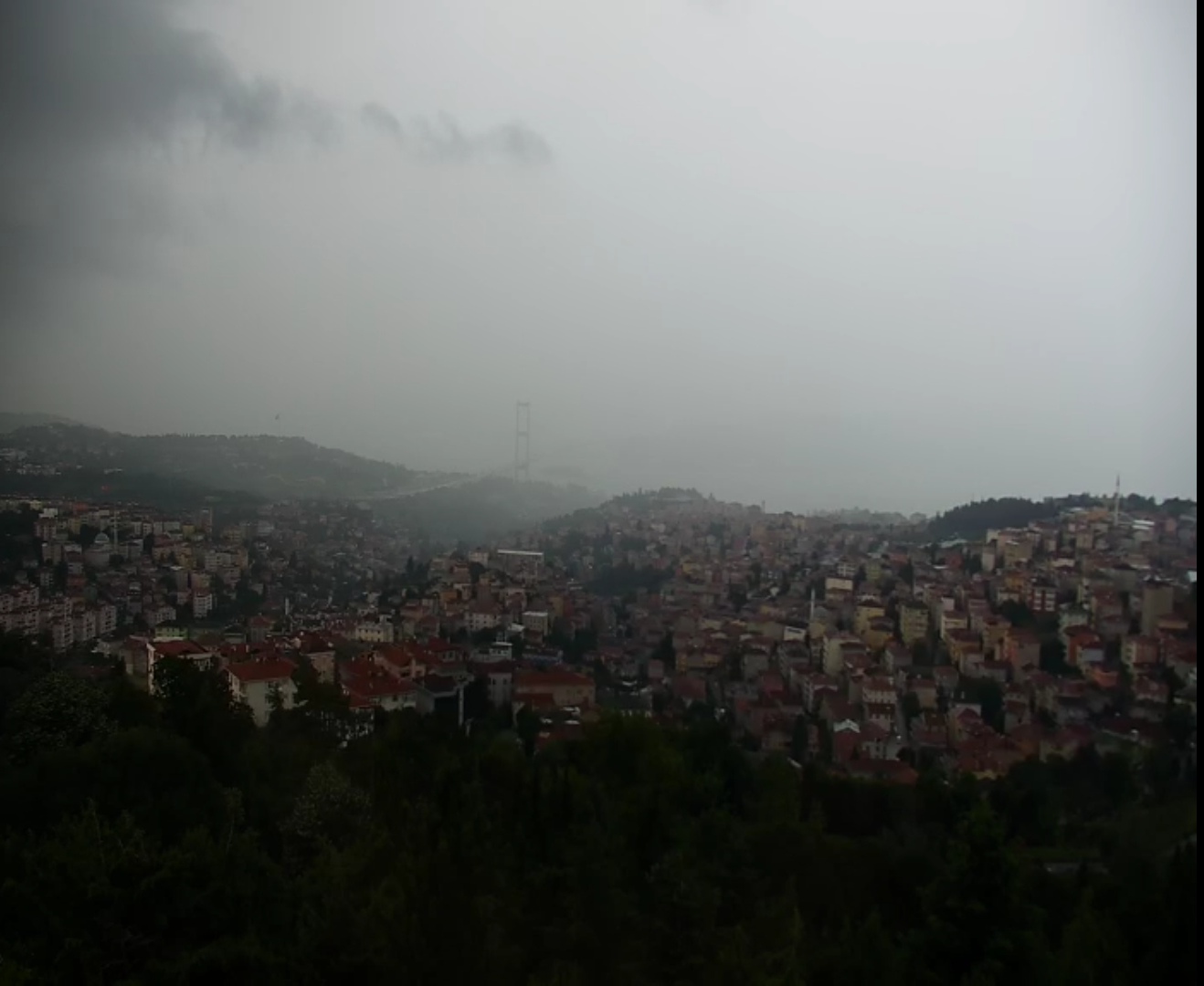 Bugün İstanbul'da oluşan kırmızı ve mor kütle beraberinde havanın kararıp simsiyah olması ve bıraktığı kuvvetli yağıştan Avrupa Yakası gözükmüyor.