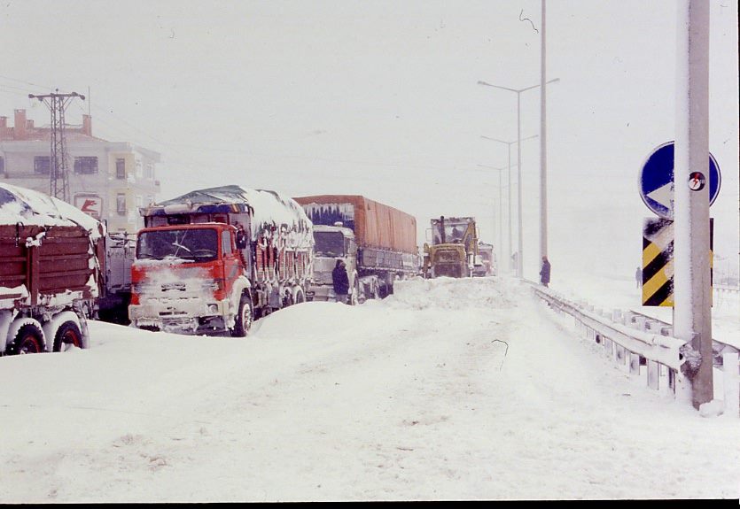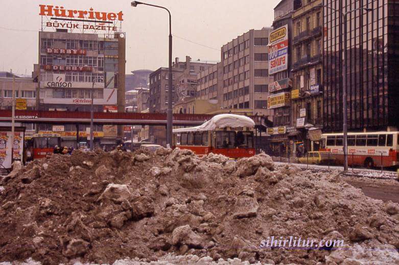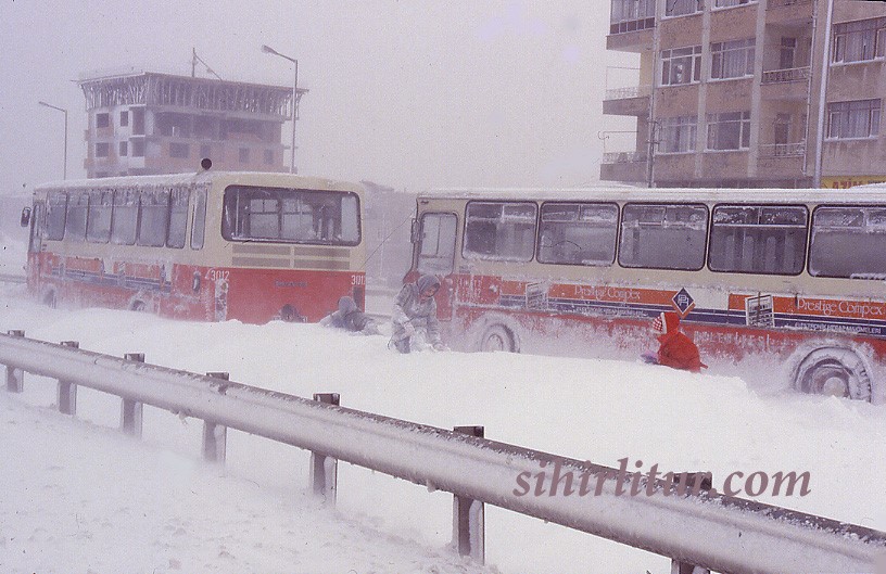 Yoğun yerleşimin olduğu kent merkezleri; baca dumanları, yol altından geçen kanalizasyon borularının sıcaklığı, egzoz ısıları nedeniyle karların en çabuk eridiği yerlerdi. 87 kışında iki hafta boyunca yer kabuğu öylesine soğumuştu ki, karların erimesine imkan kalmamıştı. Otomobilin içinden çıkıp, kameranızı kullanmaya başladığınızda, ısı farkından dolayı kamera hemen buğulanıyordu. İşte bu fotoğraf da onlardan biri... İETT şoförü aracını terk etmemiş, yarı beline kadar kara saplanmış otobüste yardım bekliyor. Diğerleri ise karın keyfinde, normal şartlarda duramayacakları yerde yatarak hatıra fotoğrafı çektiriyorlardı.